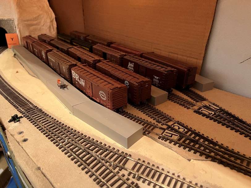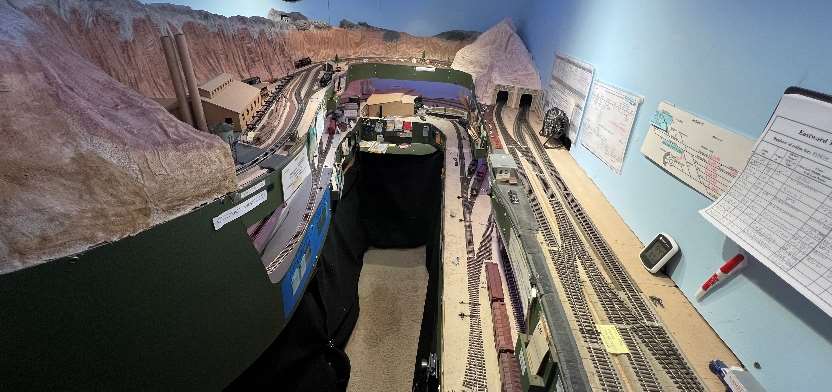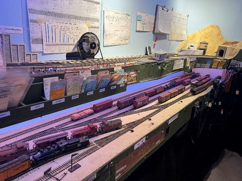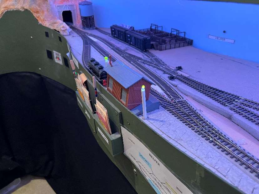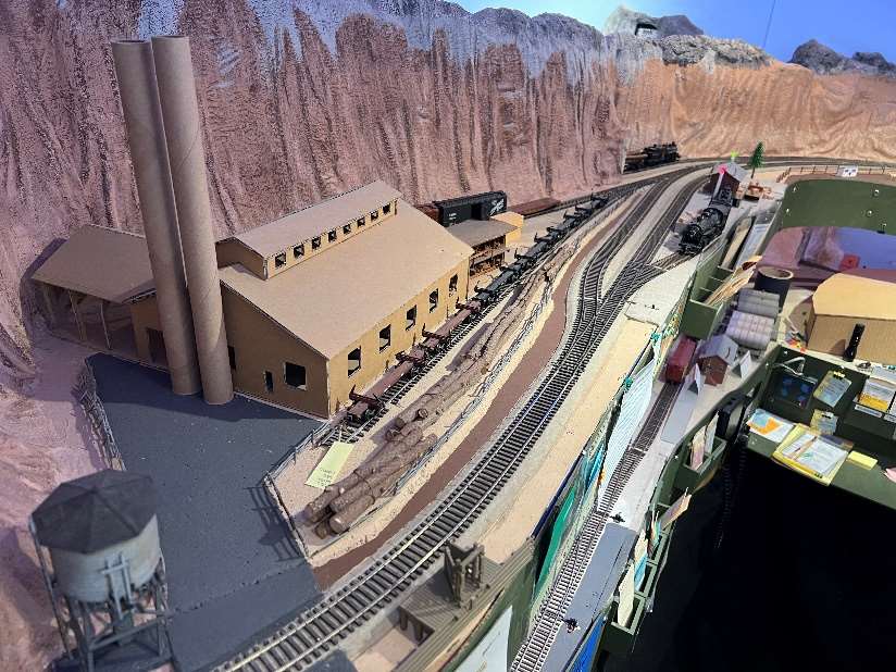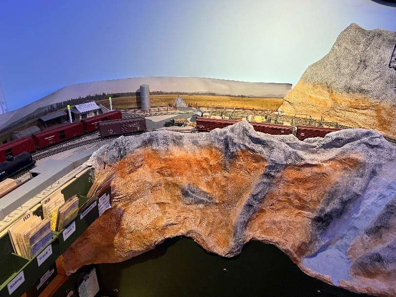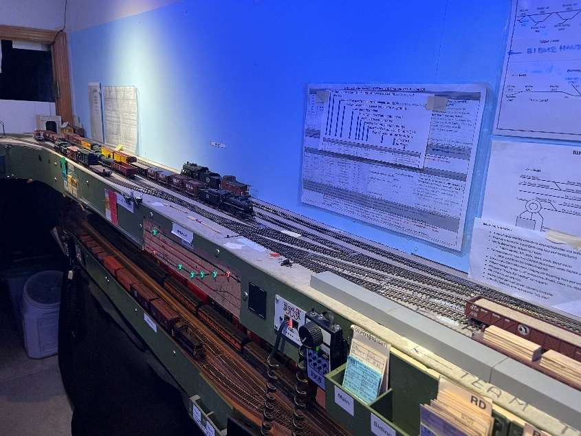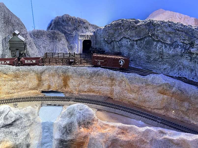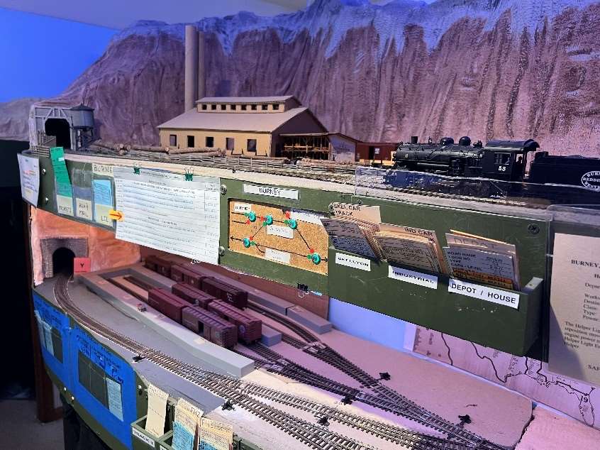 The layout is built in a 10’ x 12’ foot spare room. The BR&W is HO scale, point to point, with a 4-track stub end staging yard representing Sacramento, a 3-track staging yard representing Eureka, and a 4-track removable staging yard representing the GN interchange in Nubieber and the Northeast terminus of the BR&W in Alturas. The layout is a walk around style, full double deck, around the walls, with a center peninsula. The 100’ mainline has three towns, with three passing sidings between Redding and Bieber. The BR&W includes both an on-layout branch line and one terminating in staging. A 3% grade around the room “no-lix” connects the two levels. There is a nod-under to enter the layout. The aisle width is on the narrow side. Control is by Digitrax wireless throttles. There are several sound equipped locomotives on the layout.