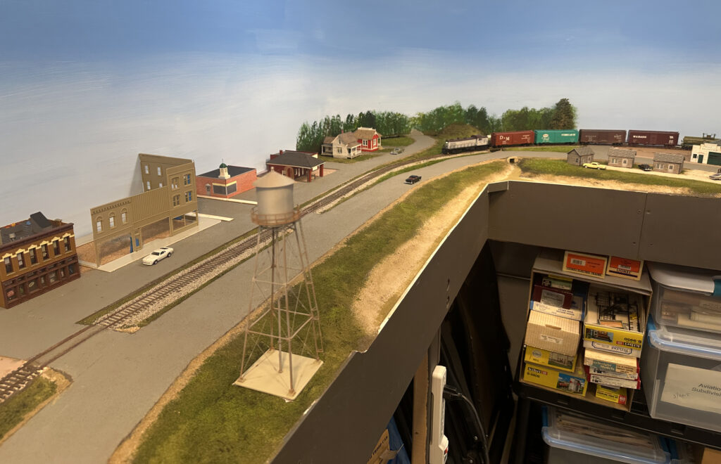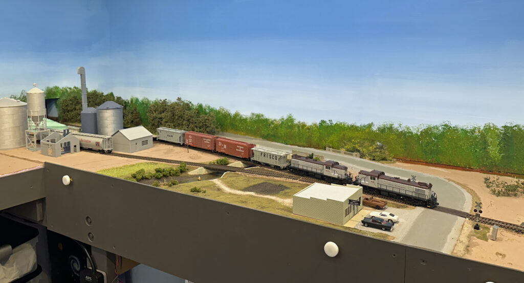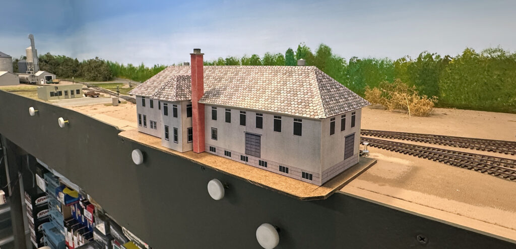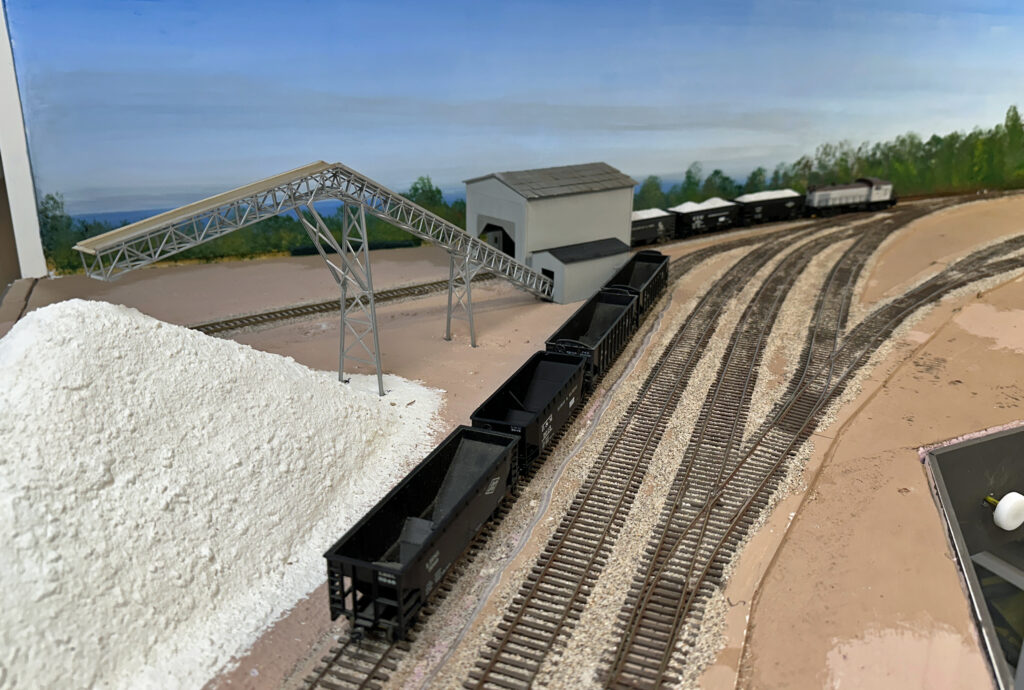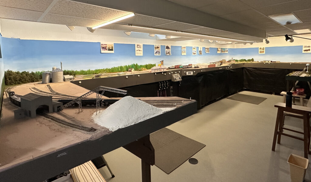 Dave’s layout represents the Detroit & Mackinac Railway around 1968. Under construction, the first phase consists of about 50 ft. of mainline covering from staging (Bay City) to Oscoda. This section features the gypsum operation at Alabaster, the yard and shop buildings at Tawas City, and fuel unloading for the air force base at Oscoda. Most buildings are mock-ups, but scenery work is progressing (about 40% complete). Planned future construction will include the rest of the mainline north to Alpena (featuring the large cement plant) and Cheboygan.