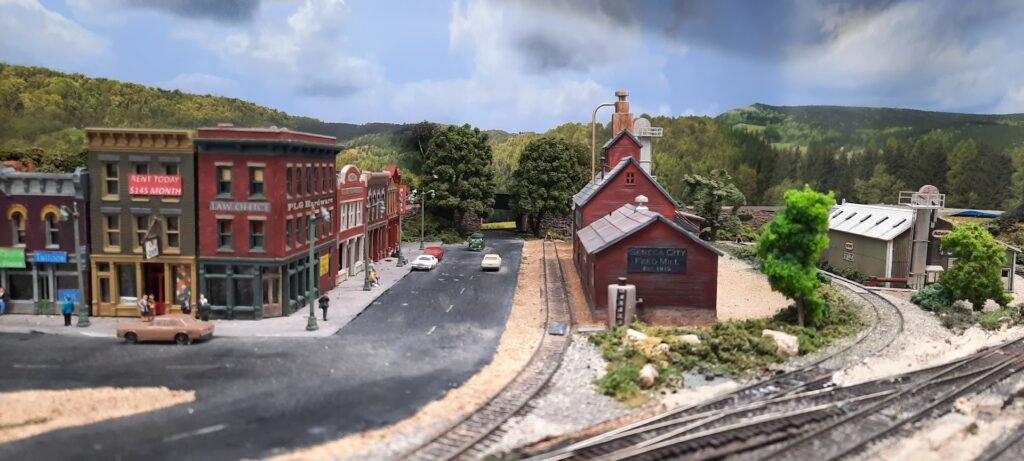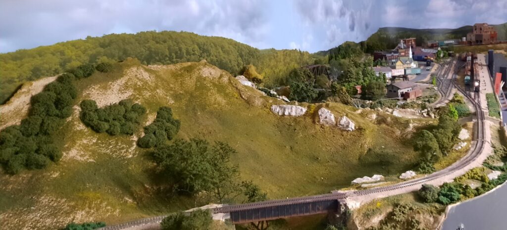The railroad is N scale and is DCC controlled with NCE components. Wi-Fi is used for wireless control as well as normal tethered throttles. The entire railroad is built with more than 20 sections ranging in size from 2′ x 2′ to 4′ x 6′. The roster includes over 700 cars and 100 locomotives, all currently in storage. Most of the rolling stock have metal wheels and are weathered.