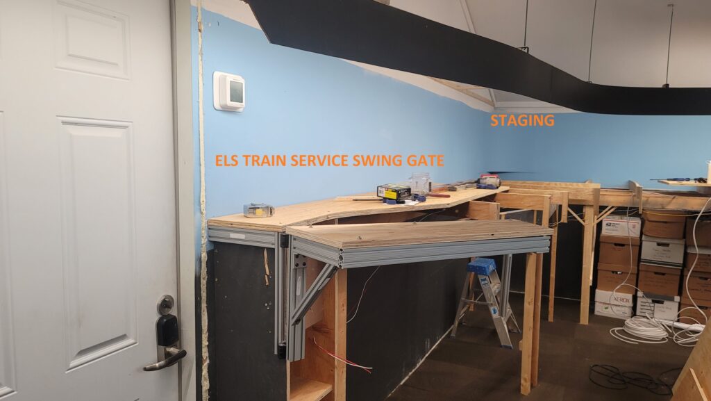 156 switches have been built using Fast Tracks. The entrance is through a swing gate custom-built by Engineered Layout Systems. One section will have the fascia finished to see how the layout is made operator friendly. Gary uses JMRI Ops to generate switch lists.