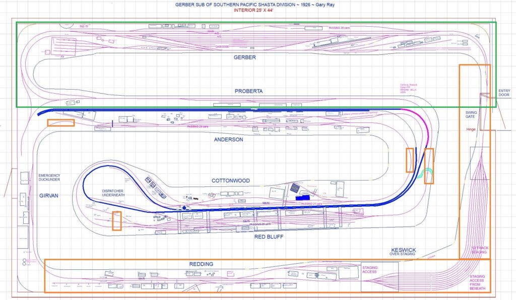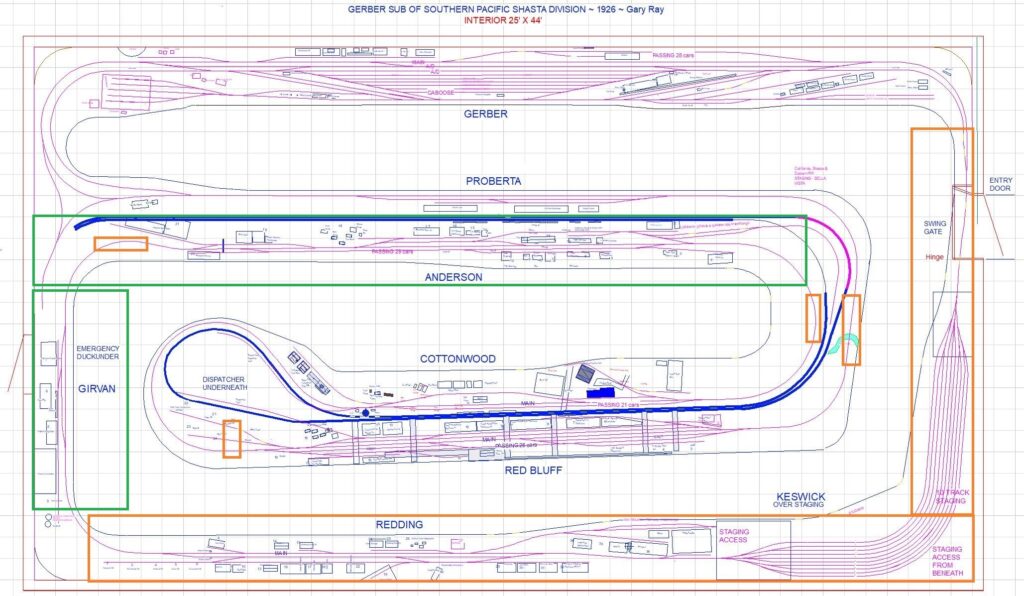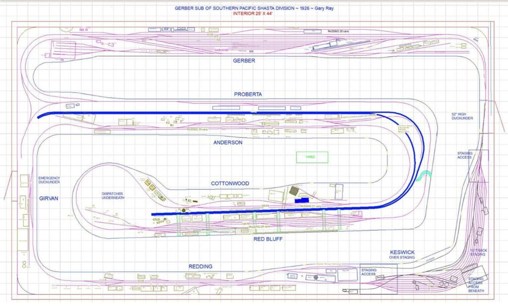 The layout starts at the Gerber Subdivision point and continues eastward through several Northern California towns and ends at the base of the Siskiyou Mountains. All town sites are LDE’s (Layout Design Elements) based on SP documents, Sanborn Fire Maps, and many visits to the actual locations.