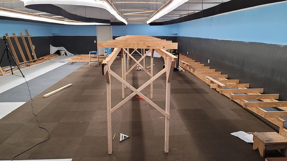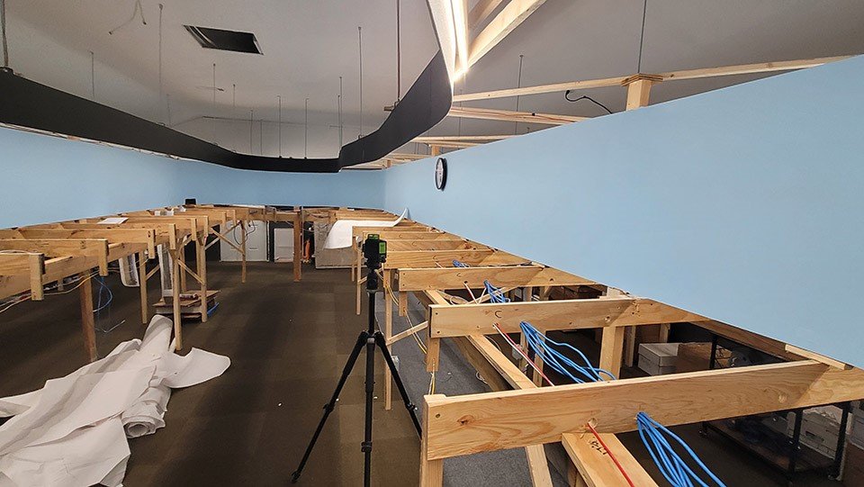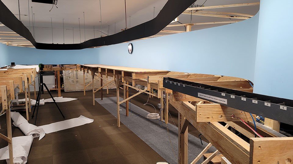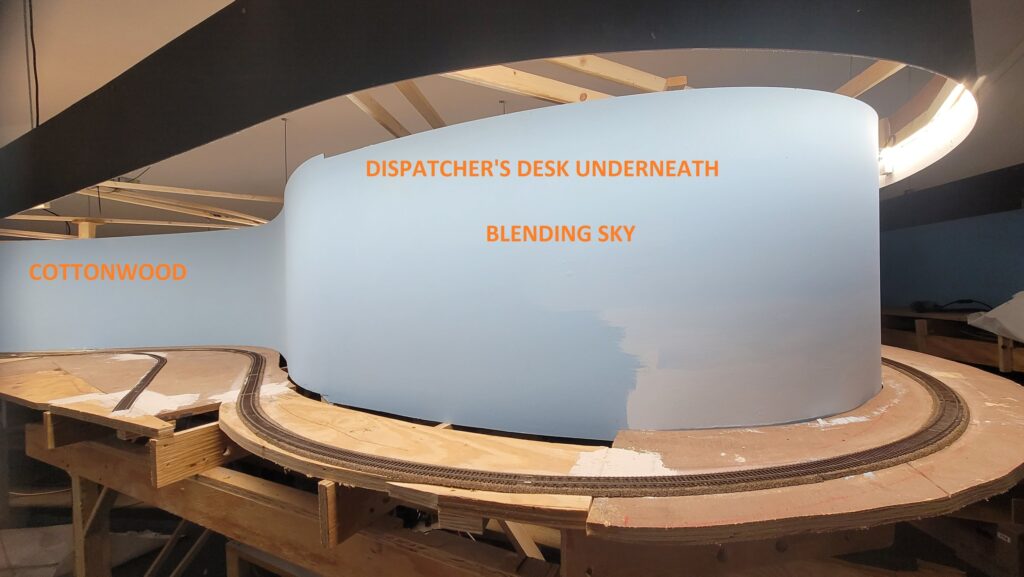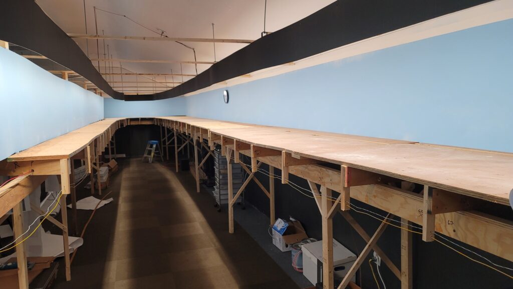 3rd Planit software was used to draw in full size. Plans were printed out on 2′ x 45′ lengths of paper. This allowed the valance and LED lighting to be put up prior to any layout construction. LED lighting strips are the only lighting in the room.