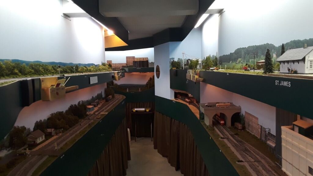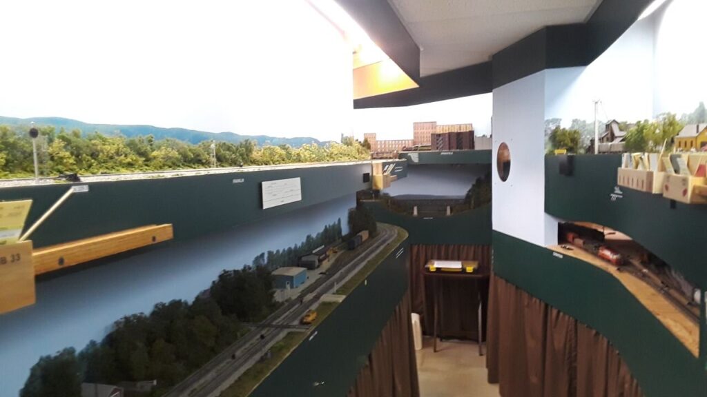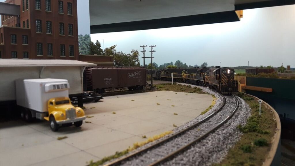 Entering the layout room through a double elevated and scenic gate you are taken back in time and surrounded by the Eastern Division of the Frisco [St. Louis and San Francisco RR] of the late 1950’s to early 60’s between St. Louis and Springfield. The 400′ of single track mainline takes you point to point through two levels from staging yard to staging yard. Scenery is 100% with a printed backdrop and lots of industry. There is lots of railroad squeezed into this 16′ x 30′ space.