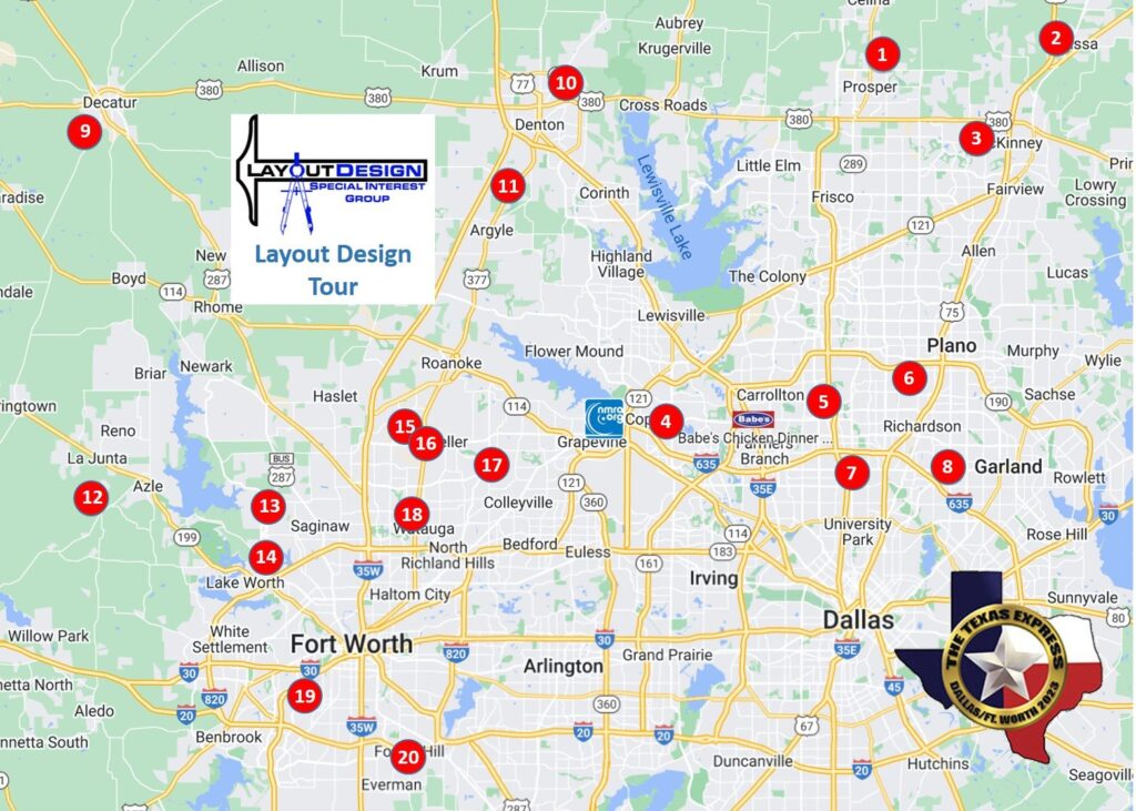 Below is a map with the approximate locations of the tour layouts. A detailed handout of the layout locations will be provided Wednesday morning at the LDSIG General Membership Meeting in the SIG Room to those who have signed up for the Wednesday Layout Tour.