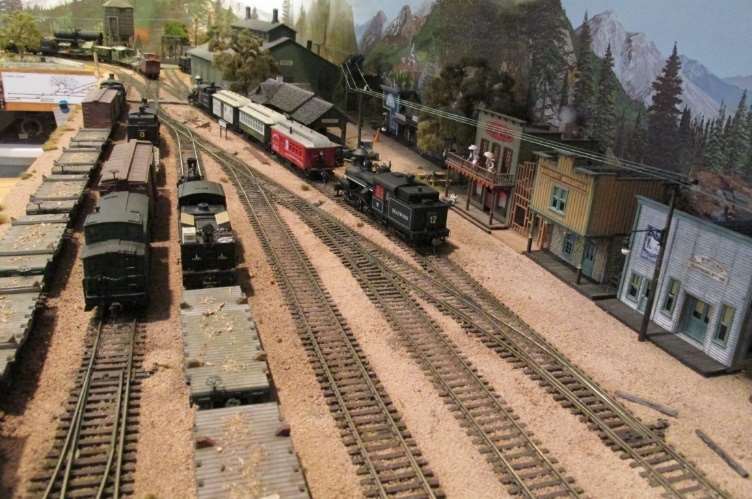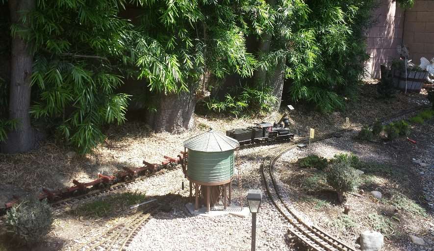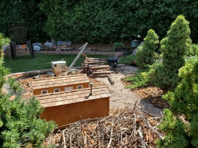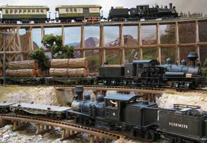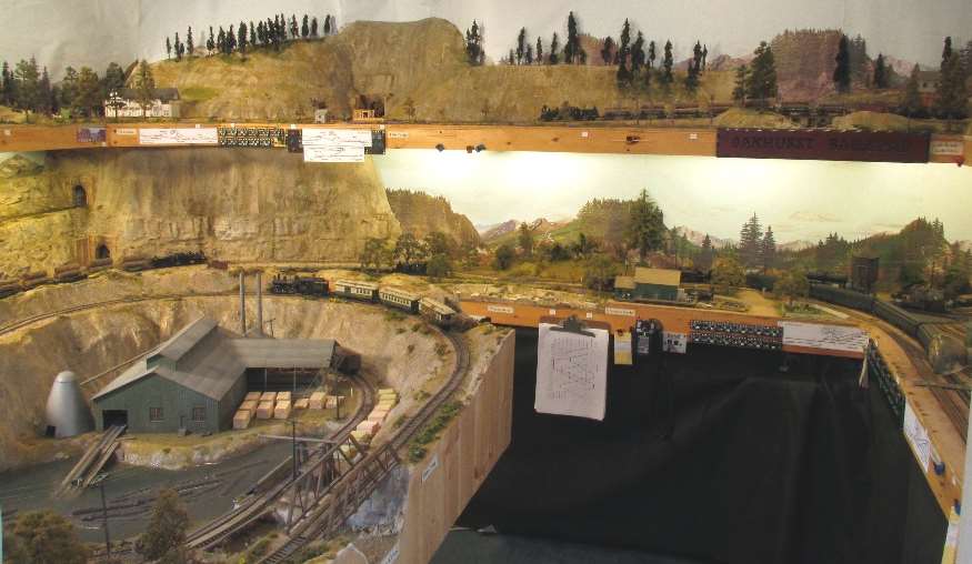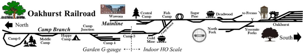 The Oakhurst Railroad is a two-level branch line point-to-point railroad with a helix, an optional continuous run, and an operational “connection” to an outdoor garden railway. A complete round trip train run can be up to 6 scale miles. For operations, trains are put together in the Oakhurst yard and then travel to the logging or mining areas on the upper level and some “connect” to the outside garden railway. Logs are taken from Camp 6 in the garden to the North Fork sawmill indoors. Cut lumber and freight are taken to Oakhurst for interchange with a Southern Pacific branch line that connects to the mainline in Fresno (staging). Passenger trains take guests to and from the Yosemite resort in Wawona and the campground in the garden at Happy Camp. A complete run with some of the trains can take more than 2 hours. For the transition from inside HO to outdoor G-gauge, a fleet of similar car types inside and out are used, and waybills and log loads are swapped at the connecting point at Camp 3. The layout was featured in the July 2016 issue of Model Railroader and the March 2024 issue of the NMRA Magazine.