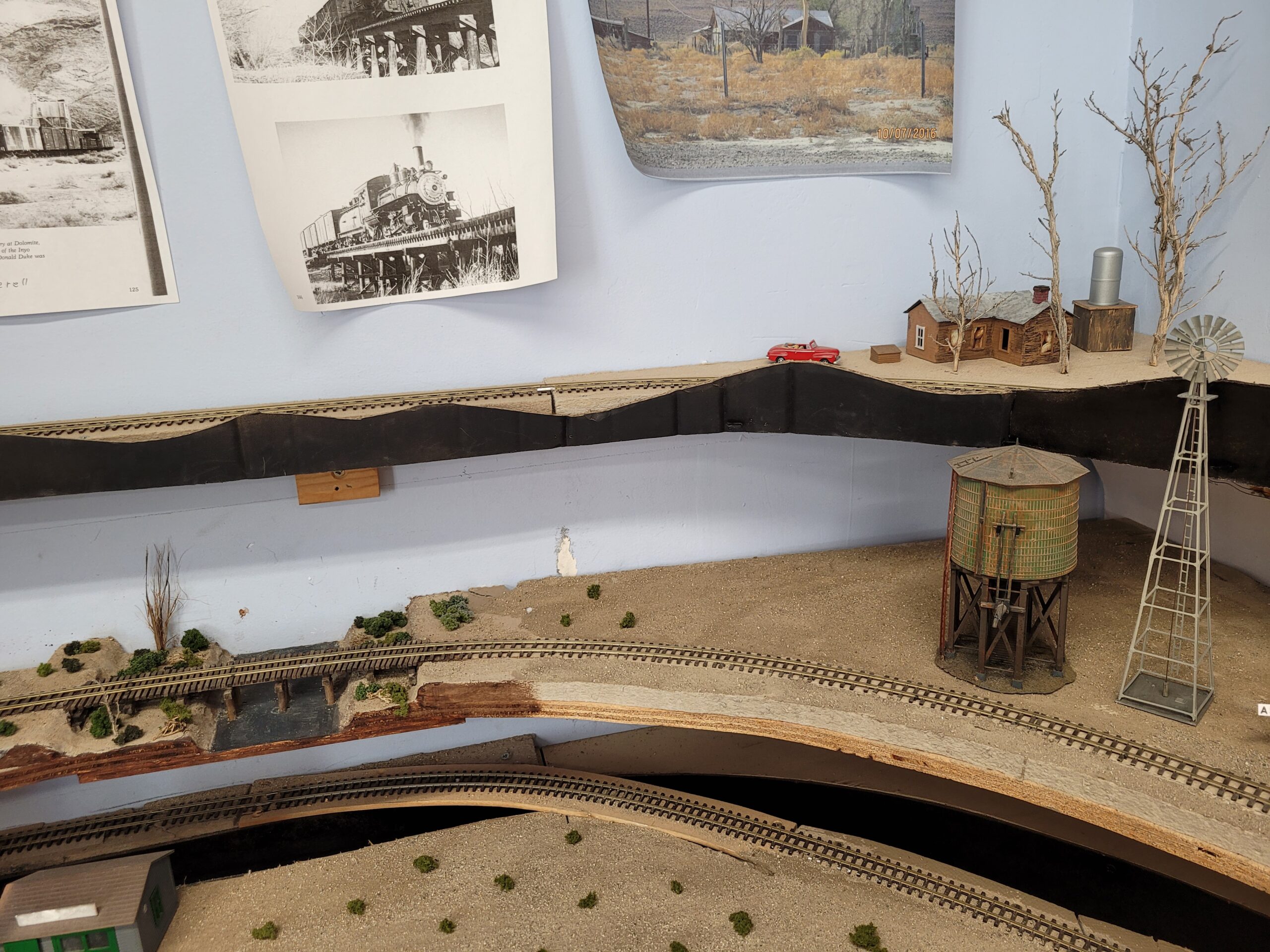 It has a few towns, running from Laws to Keeler with Oweno in the middle and turntables at both ends. It has a scaled down replica of the Oweno transfer trestle with a Std Guage run going to Mojave. It’s not very big, but it is fun to operate with two drop-ins on one end and 3 on the other.