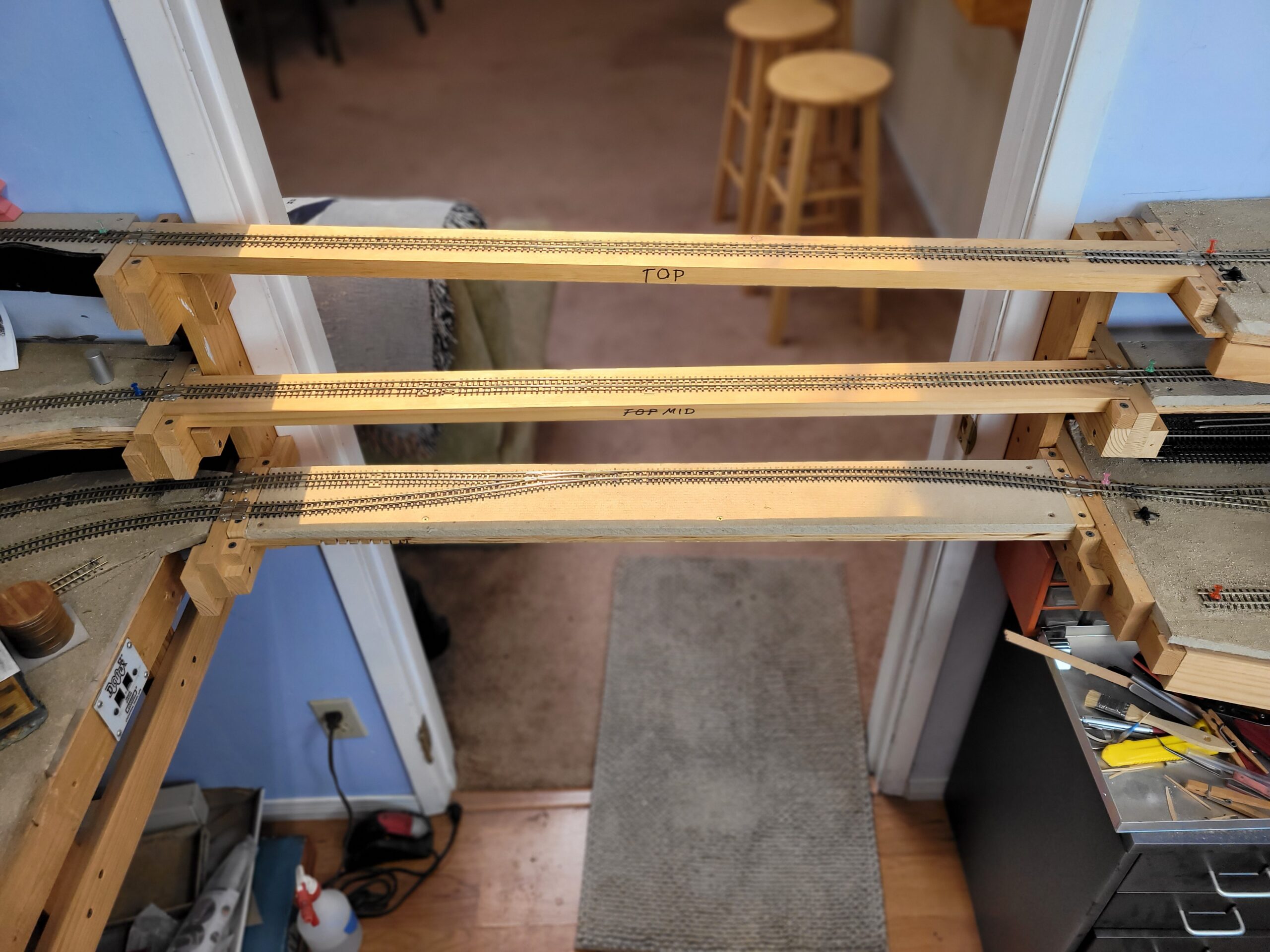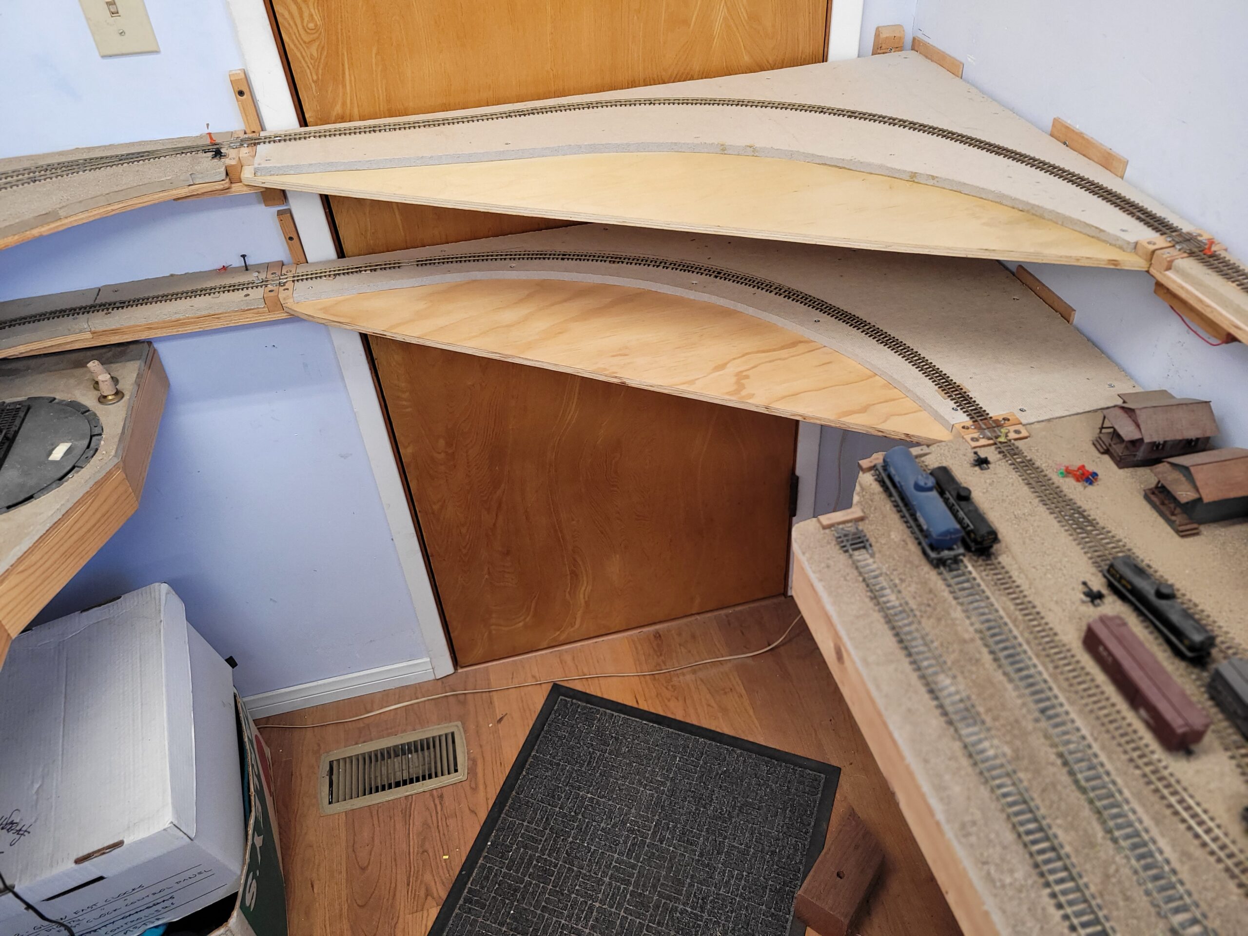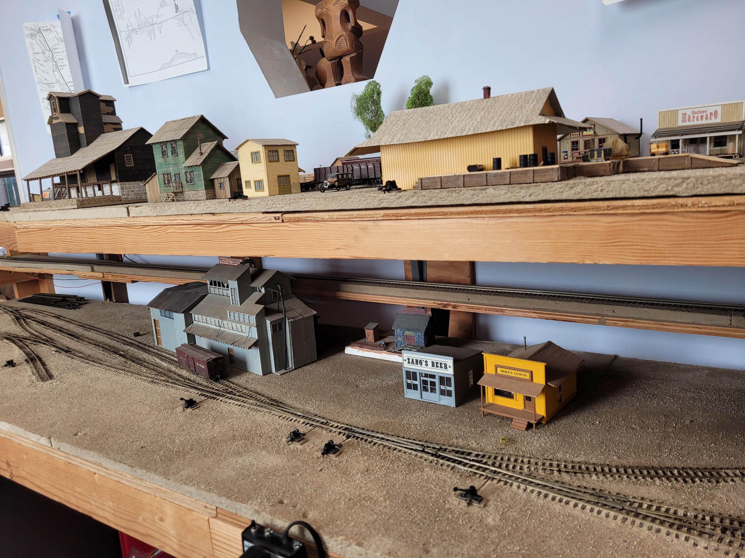 A dozen years ago I got bitten by the slim princess in the Owen’s Valley and her saying build me. I looked around and all I had was a storage room 6’ x 14’ with 2 doors at opposite ends and a window on the wall halfway between them. I took the challenge. When I finished, I had 3 levels and 5 drop-ins. I scrounged up buildings from swap meets and some friends and had a railroad with 65 running ft. of track in HOn3.