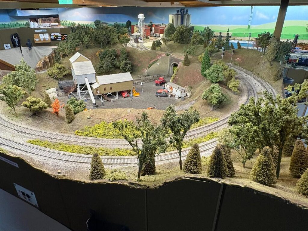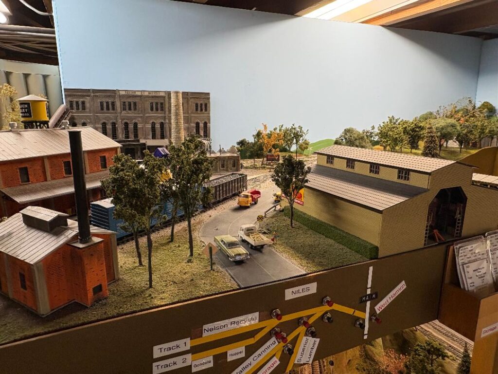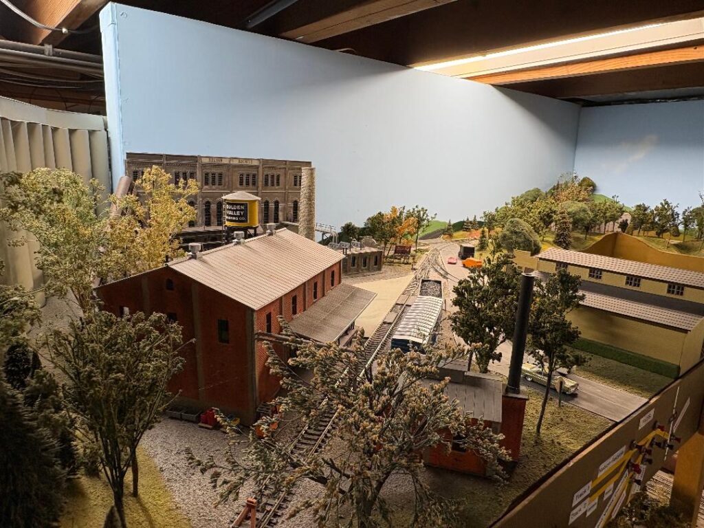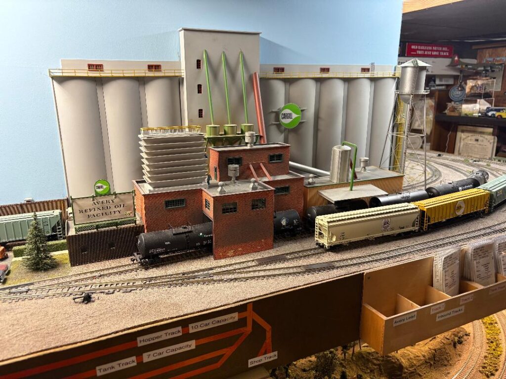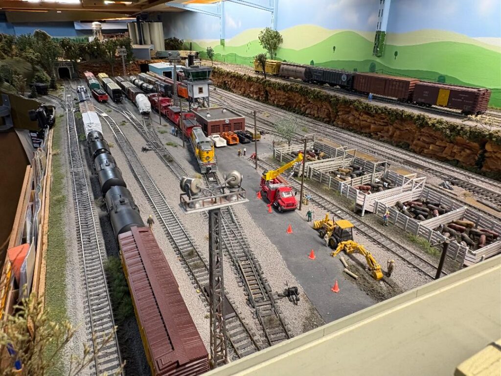 Mike Bruss’ layout is the Union Santa Fe & Southern Railroad, which is owned by the Union Pacific, the Santa Fe, and the Southern Pacific Railroads. The USF&S’ main purpose is the switching of industries in the towns of Lincoln, Julesburg, and Sidney. The rest of the Railroad has trains running from Chicago to Portland and Portland to Chicago. There are through freights, locals, and Passenger trains. The layout has two levels and is in three (3) rooms. During a four-hour OPS Session, as many as thirty (30) trains can be run. During the OPS Session, the layout is controlled by a dispatcher who sits at a portable Dispatchers panel, and orders are given over a radio that each operator has. I have at least seven (7) to eight (8) operators per session. The layout was started in 1992 and has been upgraded four (4) times since then. Control is DCC.
