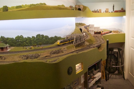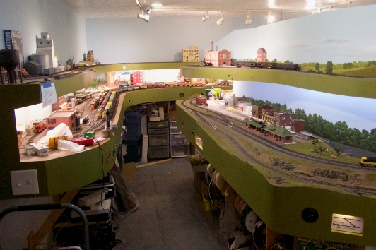 Mike’s Layout is 14 ft. x 18.5 ft. double deck layout with 130 feet of mainline track on the bottom deck, and about the same on the upper deck and 99 feet of track in the beautifully designed helix by Gary Brooks. All bench work is completed, and all the code 83 track is laid, and some scenery work is done. The layout is designed for both operation and running trains. Time frame is late 1960’s through 1983. DCC control is by NCE. Cameras are allowed.