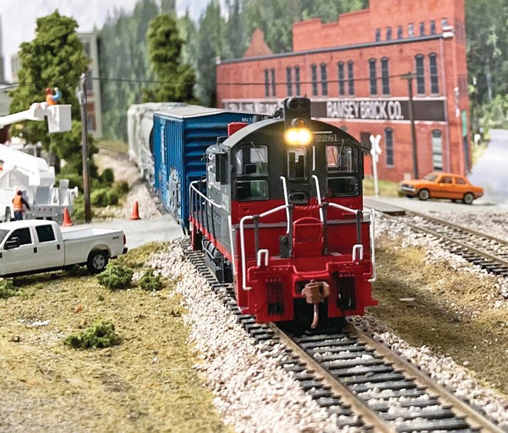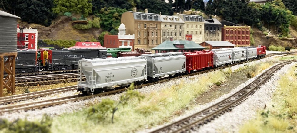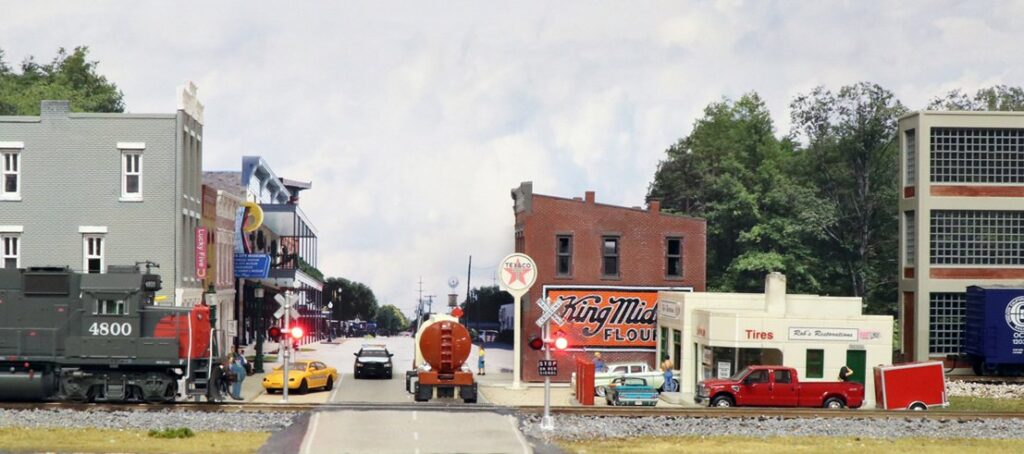 The mainline passes through Norwood, which has a main street scene. A few early buildings from plastic kits line the street and fade into a photo backdrop created by a shot of downtown Grapevine, Tx., home of the 2023 Texas Express.